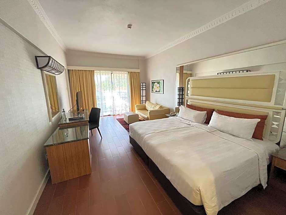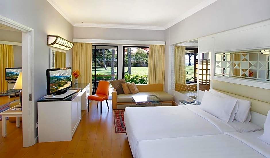 Pool Terrace is 355 square feet and includes either a double bed 131-150 width or 2 single beds 80-130 width plus desk, satellite tv , hairdryer, tea and coffee making facilities , and safe.
